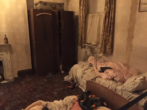 The tiny flat at 102 Edith Grove in west Chelsea, London, is located in a district that was derided, centuries ago, as the “World’s End.” The name still seems apt: from the looks of things, I could push my fist through a water-damaged wall pretty easily, but I’m scared of what I might find living behind it. Small lamps in a few corners offer dingy light. Food-encrusted dishes and sticky glassware are stacked in the sink and on most available surface areas, soiled hand towels of dubious purpose and dozens of half-smoked cigarettes and butts abound, wallpaper is streaked with dirt, days- or weeks-old milk bottles gather like so many low-rent science experiments, trash cans overflow, half-empty beer and liquor bottles waft stale scents of earlier good times. On the three unmade single beds, sheets are stiffened into dioramas.