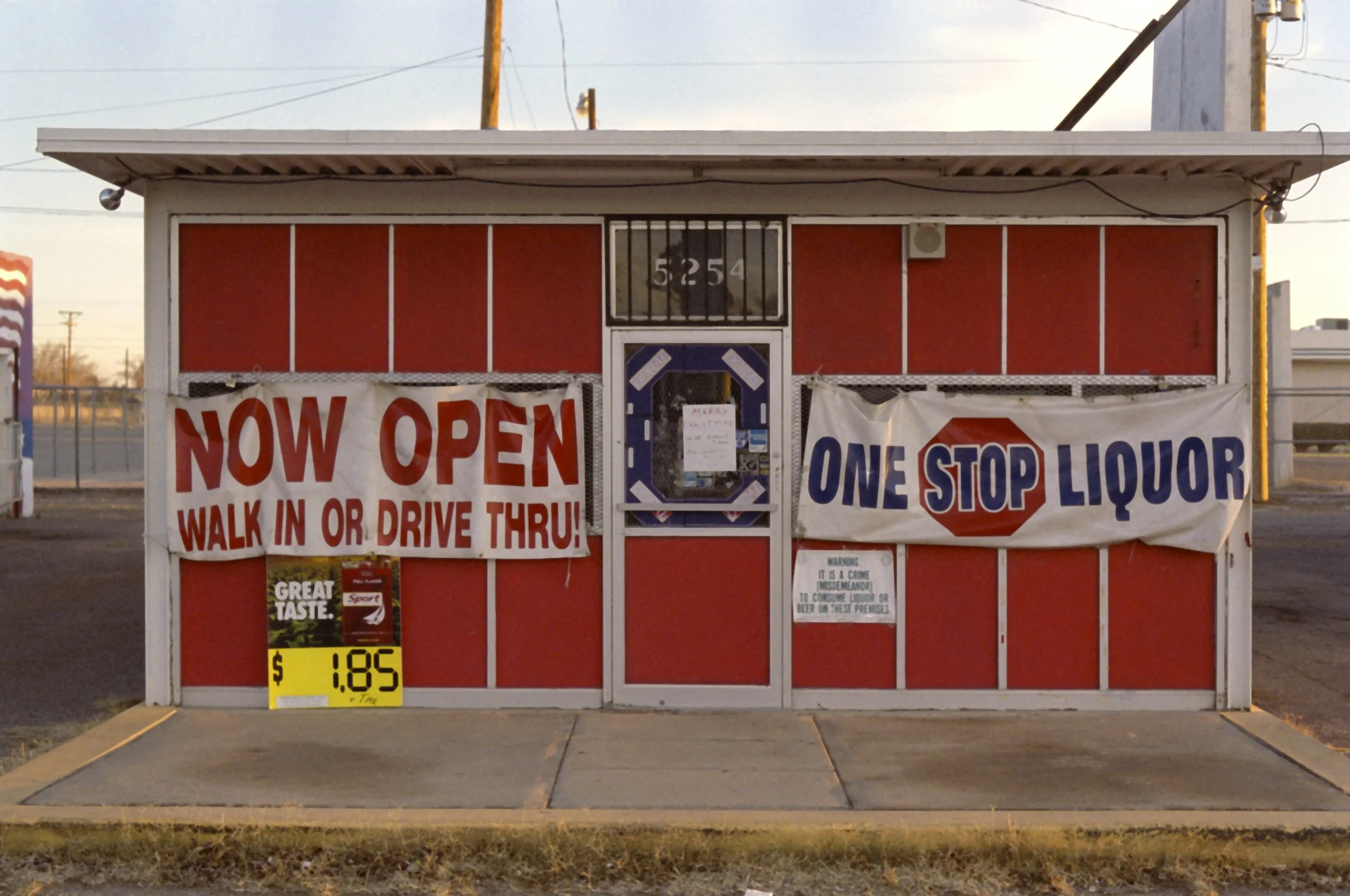 Red and white storefront numbered “5254.” On the left of the door is a white sign with “Now open. Walk in or drive thru!” in red text. On the right of the door is a white sign with “One stop liquor” in navy blue text. On the sign, there’s also a red octagon around the word “stop,” resembling a stop sign. Below this sign is a drink advertisement with the text “Great taste” in white and a yellow price tag with “$1.85” in black text.