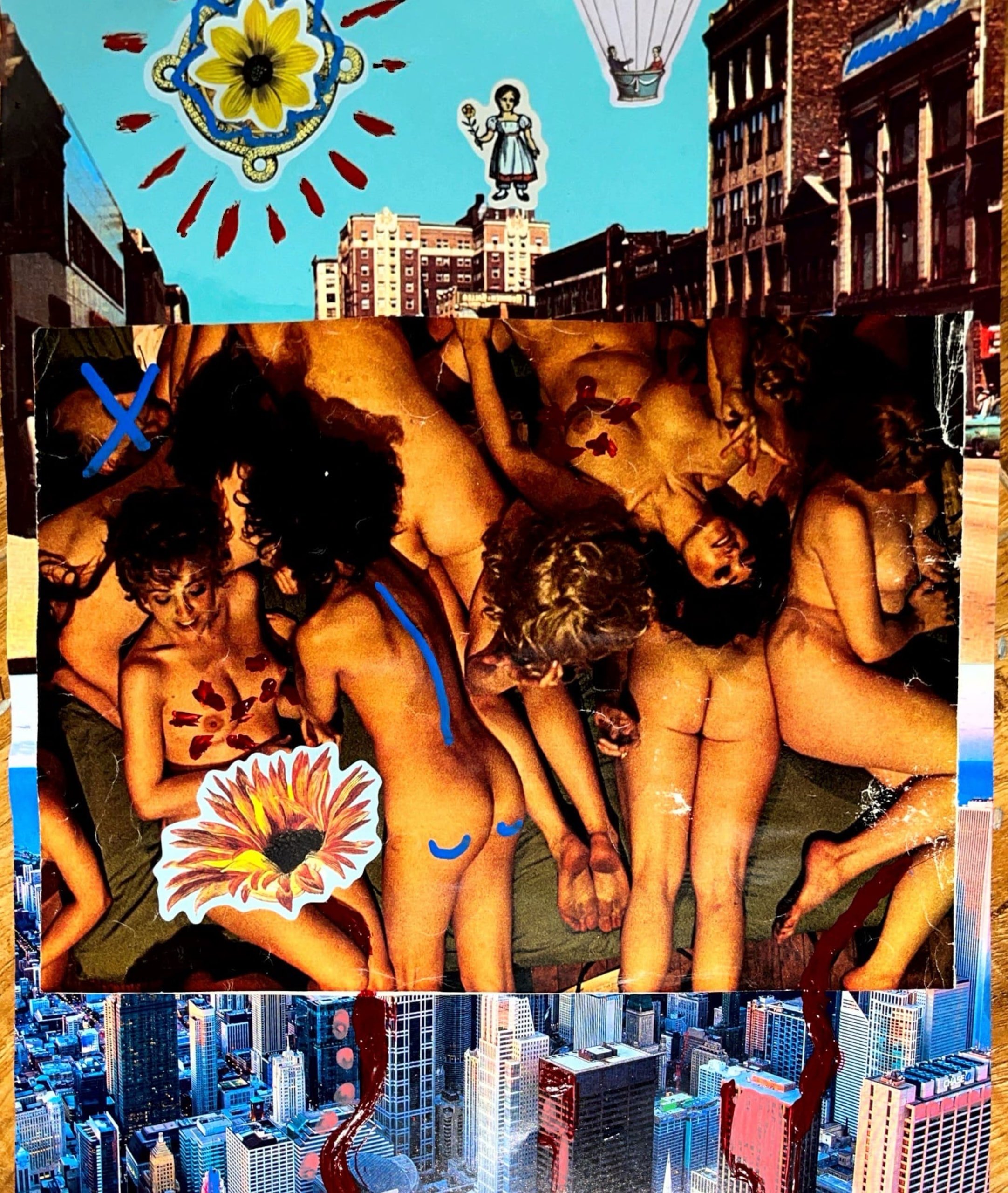 Magazine page of eight naked women lying on a bed. Layered beneath are two magazine pages of skyscrapers and buildings. On the top center of the page is a sticker of a girl holding a yellow flower. To her right is a sticker of a couple in a hot air balloon. To the right is a sticker of a yellow flower with red lines painted around it.